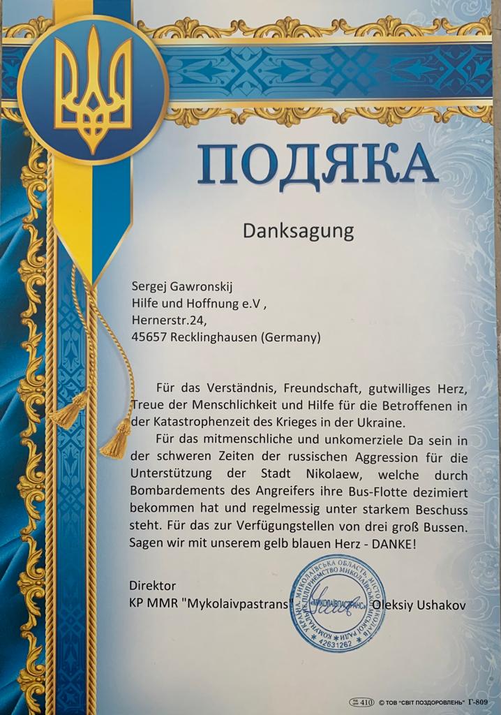 Seit Beginn des Krieges wurden viele Fahrzeuge der Stadtverwaltung von Mykolaiv an die Armee übergeben. Jetzt kehrt allmählich das normale Leben zurück, und im April wurden dank unserer Partner Sankt Augustin and friends hilft e.V. @Richter Beratung „Перевізник“ – „ФОНД „ПОЗИВНИЙ ГОРИНИЧ“drei Personenbusse erhalten, die jetzt auf der Strecke sind !