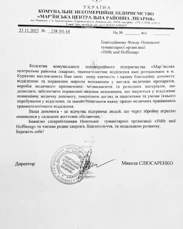 Die Hilfe ging an das kommunale gemeinnützige Unternehmen „Marinska Central District Hospital“, Direktor Slyusarenko Mykola Yevgenovych.