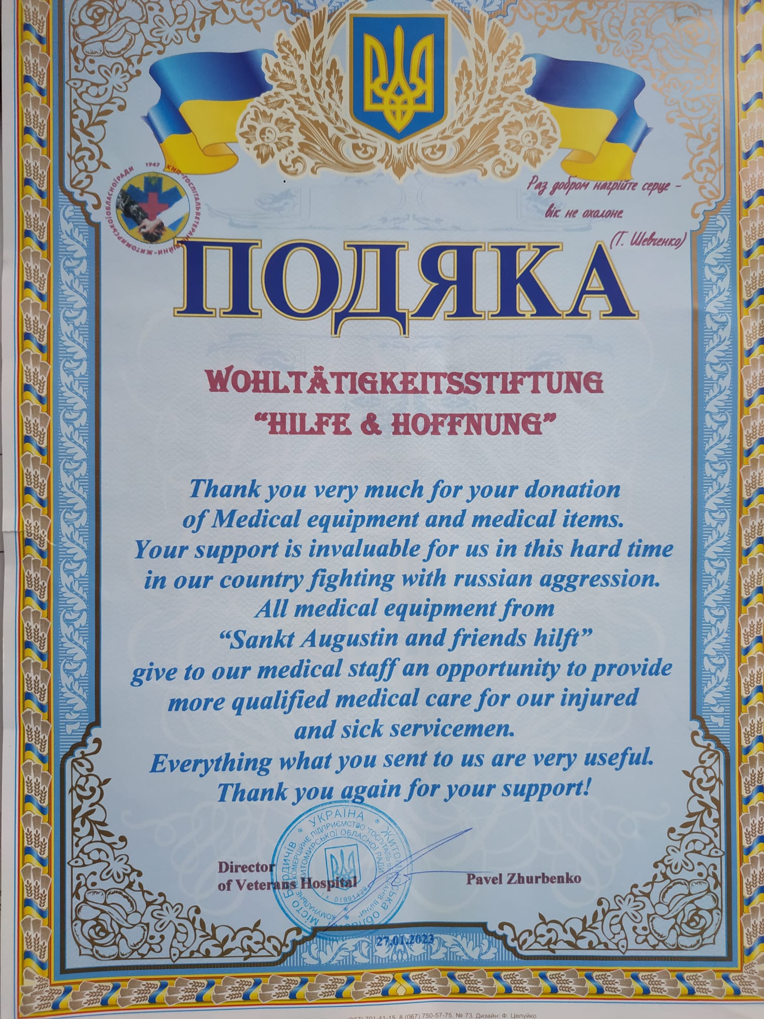 Ein weiterer Punkt auf der Landkarte der Ukraine, wo unsere Hilfe geliefert wurde – das Veterans Hospital in Berdychiv, der Region Zhytomyr. Die mitgebrachte medizinische Ausrüstung hilft bereits bei der Behandlung unserer Kriegshelden! Slava Ukraini! StandwithUkraine!